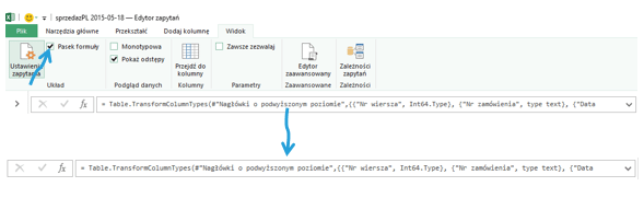 Widoczny pasek formuły jest niezwykle pomocny, żeby zrozumieć składnię formuły i jej słabe punkty. Pasek formuły daje też możliwość szybkiej modyfikacji zapytania tak, aby było efektywne. Aby wyświetlić pasek formuły wystarczy otworzyć Edytor Zapytania i zaznaczyć Pasek Formuły w Widoku – teraz pasek będzie zawsze widoczny.
