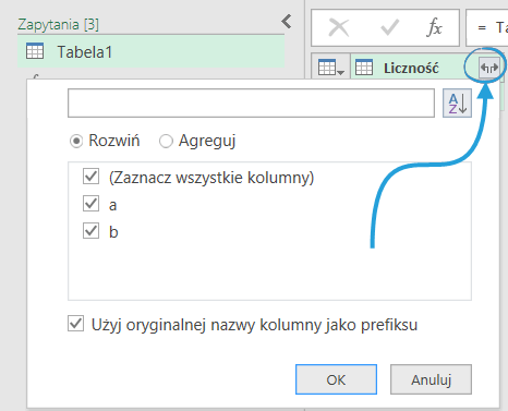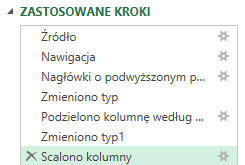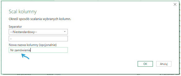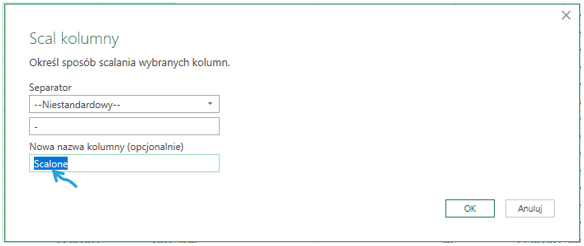 Możemy wskazać separator oraz nową nazwę kolumny. Ważne jest jednak, że operacja wykorzystuje znowu wszystkie nazwy łączonych kolumn, więc przy zmianie nazw, może się nie powieść.