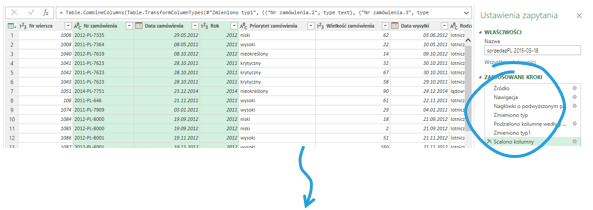 Przy każdorazowym imporcie tabeli lub np. podziale kolumn, automatycznie generowane zmiany określą typ kolumn bez naszej ingerencji. Kroki te jednak zawierają formułę, która odnosi się do wszystkich kolumn w tabeli. Kiedy jedna z kolumn zostanie usunięta lub zostanie zmieniona jej nazwa w danych źródłowych przy odświeżaniu napotkamy na błąd. Aby przejrzeć formuły odnoszące się do poszczególnych zmian wystarczy kliknąć na nazwę zmiany po prawej stronie, aby wyświetliła się dana formuła.