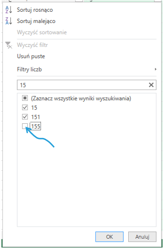 Jako przykład zastosujmy filtr, w którym będziemy chcieli wykluczyć wartość 155. Zacznijmy wpisywać tę wartość, następnie odznaczmy liczbę.