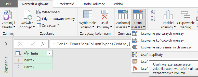 Dziesiąta pułapka jest związana z usuwaniem duplikatów. Operacja nie traktuje jako duplikat słów, które mają małe i duże litery. Może to spowodować, że do modelu danych załadujemy poprzez Power Pivot lub Power BI tabelę, która zawiera duplikaty, ale nie w rozumieniu Power Query.