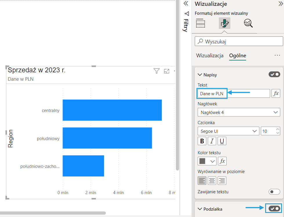 Nowa funkcjonalność znajduje się w sekcji Formatowanie (pędzel) > Ogólne > Tytuł > Napisy (to na razie błędne tłumaczenie angielskiego subtitles). Dodatkowo możemy oddzielić tytuł od wykresu dodatkową linią (sekcja Podziałka).