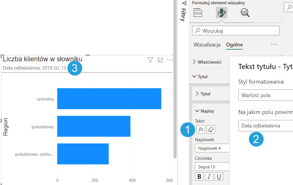 Dla niektórych danych kluczowe znaczenie ma data ostatniego odświeżenia. Możemy w modelu danych Power BI stworzyć miarę, która obliczy datę pochodzenia tabeli. Dzięki temu użytkownik na konkretnej wizualizacji zobaczy w podtytule datę. Pamiętaj, aby datę sformatować jako tekst lub włączyć ją w ciąg tekstowy. Oto mój przykład:
