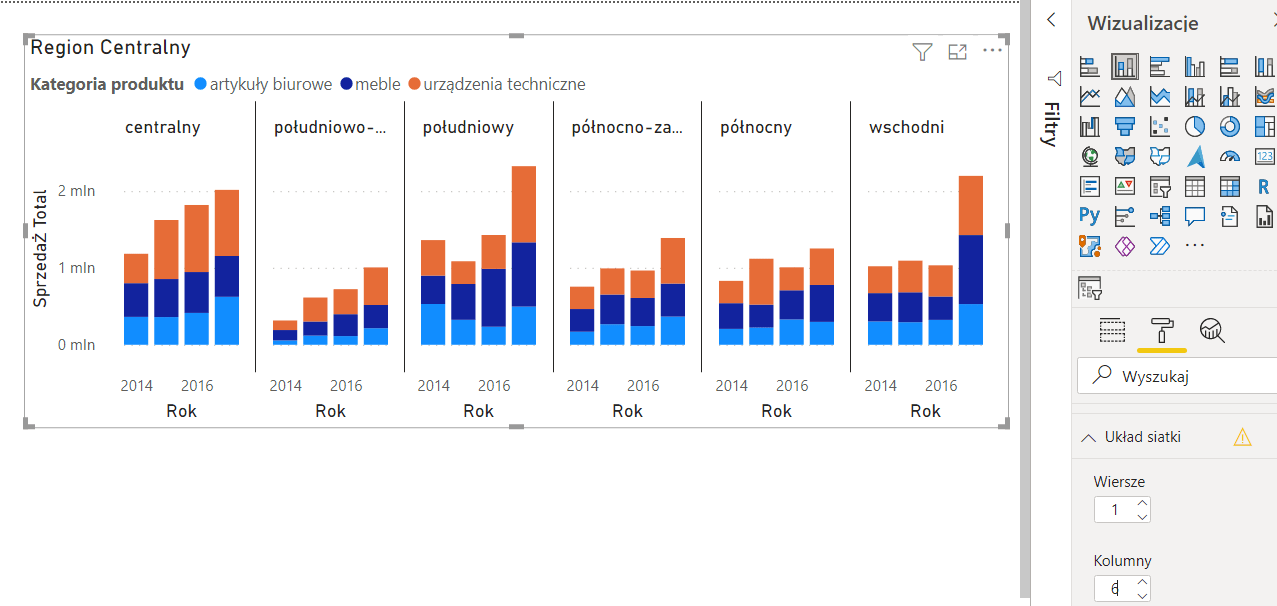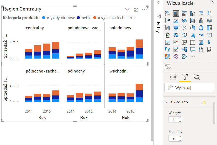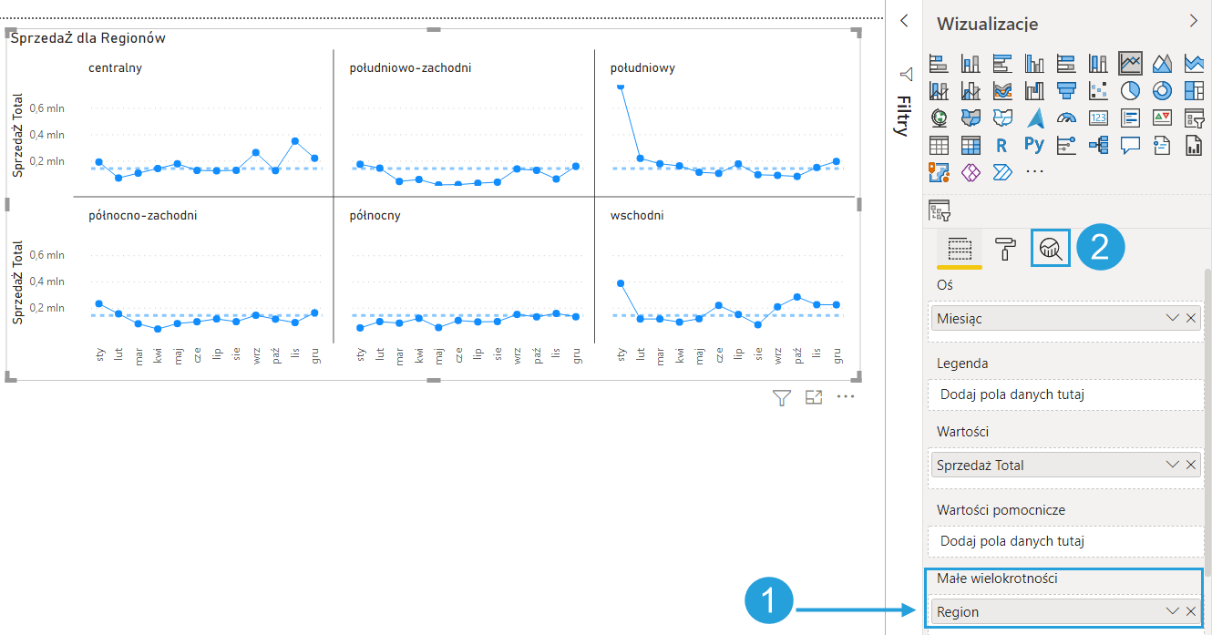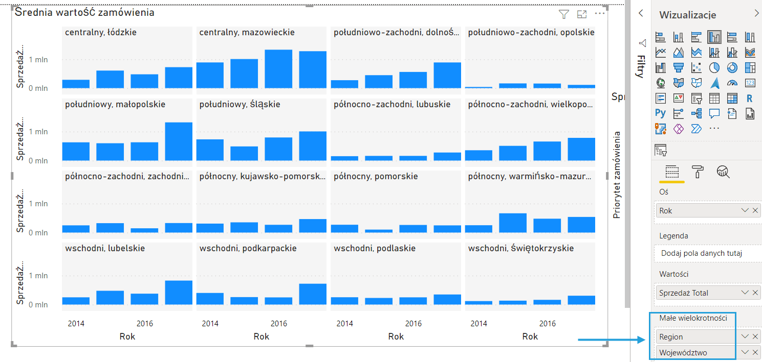 Rozwiązaniem jest skorzystanie z nowej półki w Power BI – małe wielokrotności, dzięki której podział na Regiony nastąpi samoczynnie.
