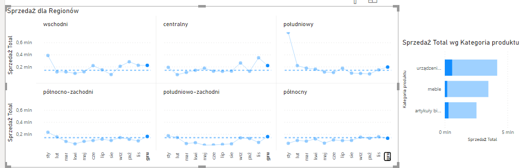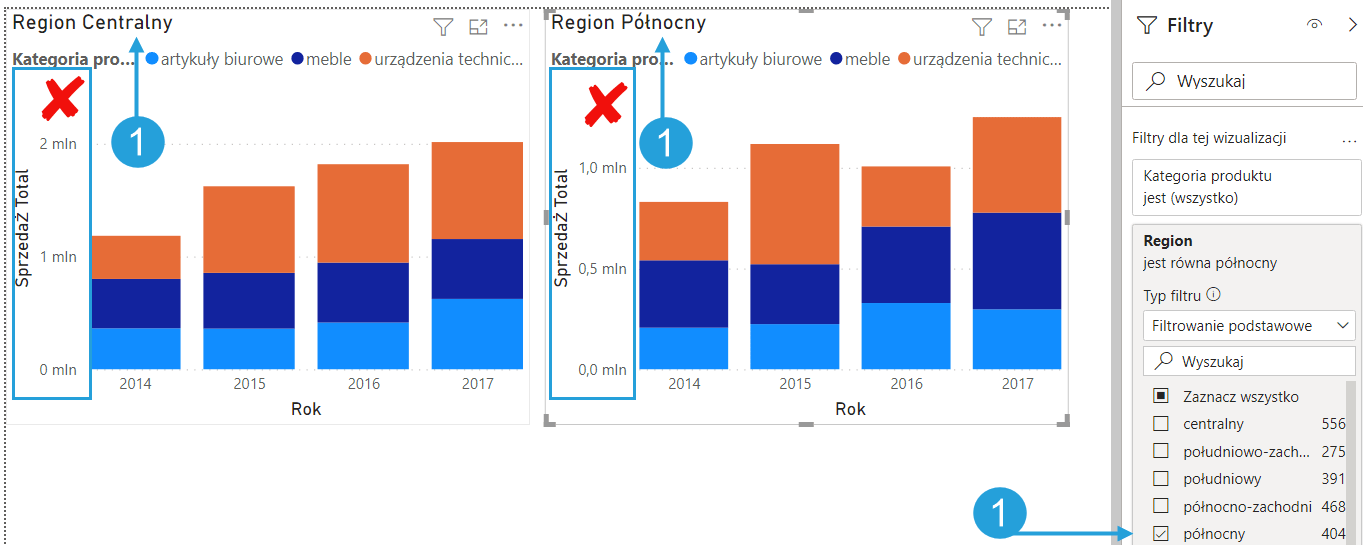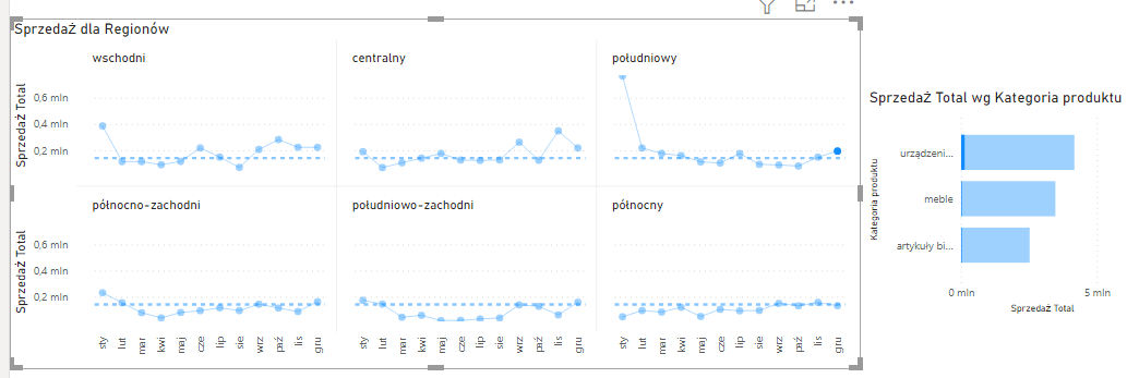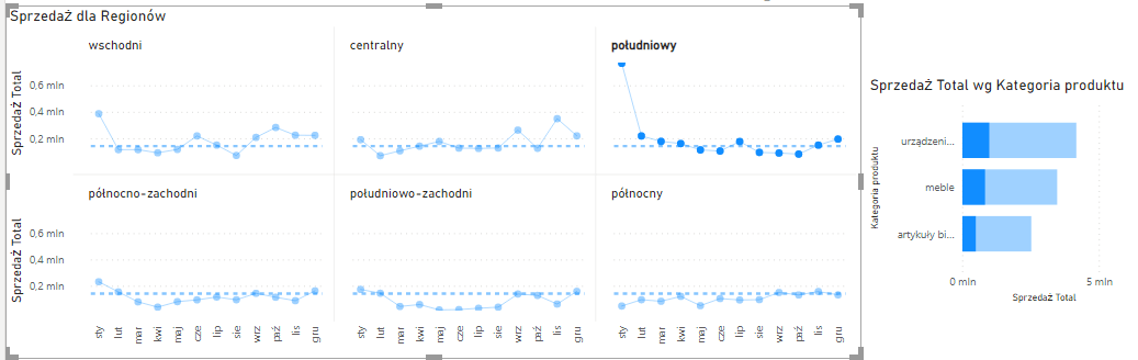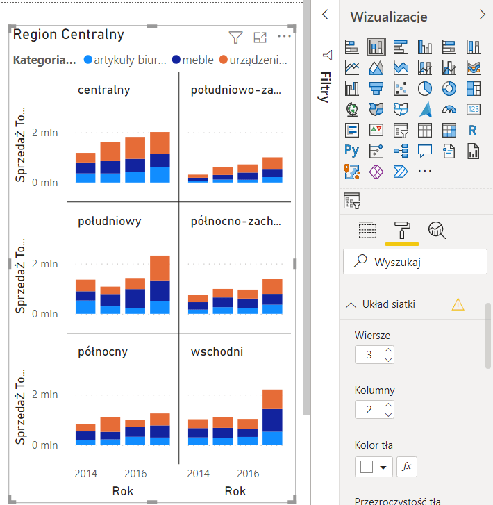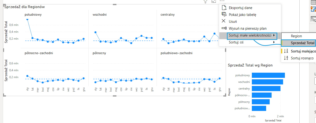 Rozwiązaniem jest skorzystanie z nowej półki w Power BI – małe wielokrotności, dzięki której podział na Regiony nastąpi samoczynnie.