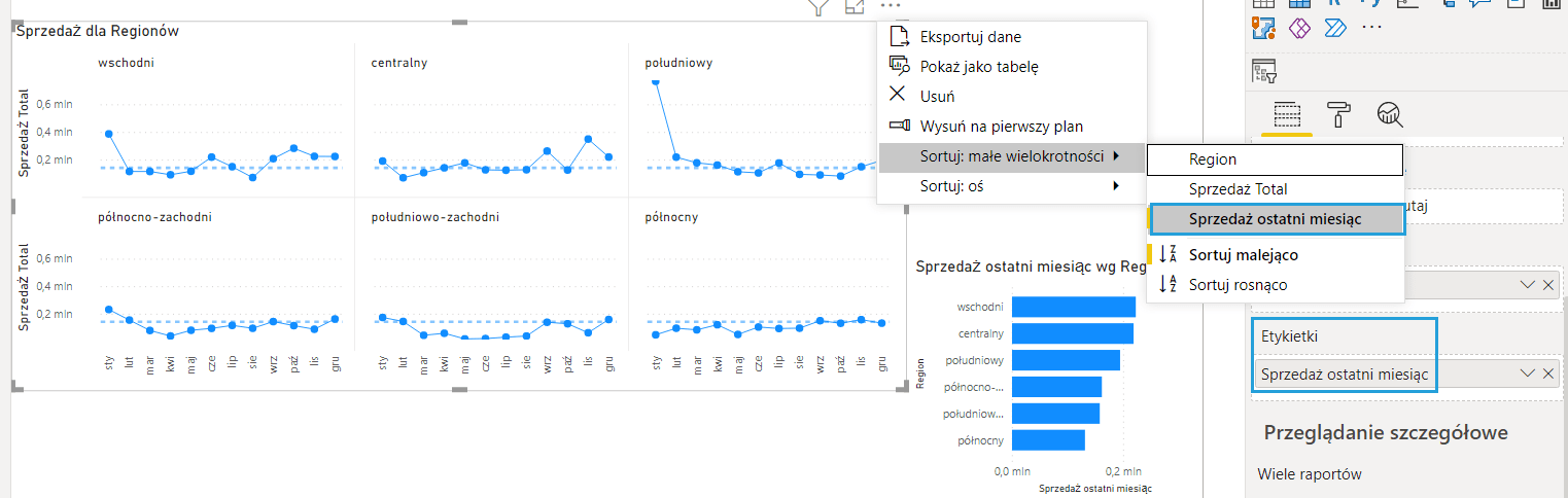Co więcej, wykres możemy sortować nie tylko alfabetycznie, ale także wg miar. Dzięki temu możemy ustawić Regiony w kolejności malejącej wg Sprzedaży Total (czyli za wszystkie wyświetlane miesiące), wg innych założeń (np. wg miary Sprzedaż za ostatni miesiąc, umieszczonej na półce Etykietki).