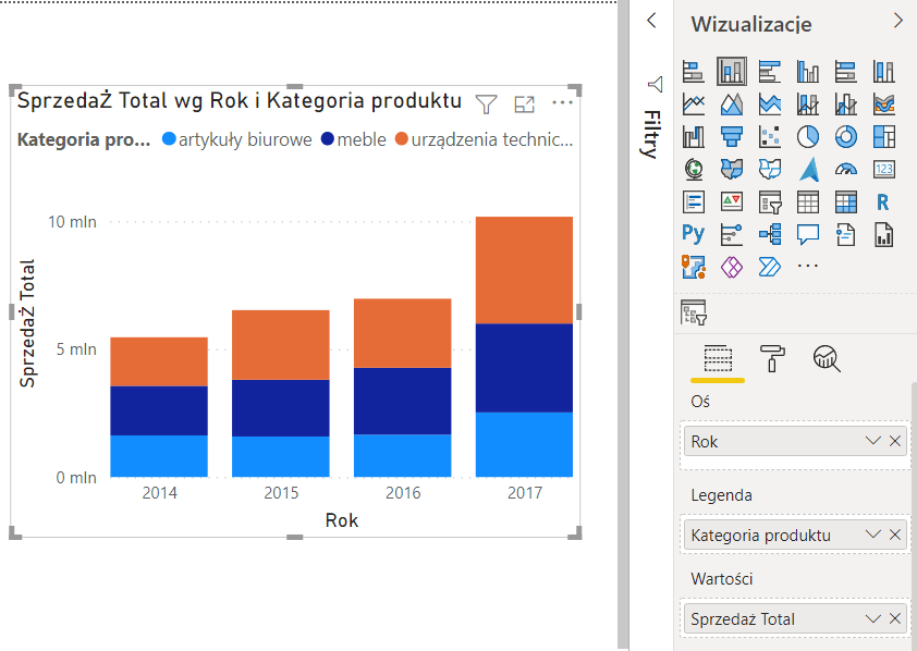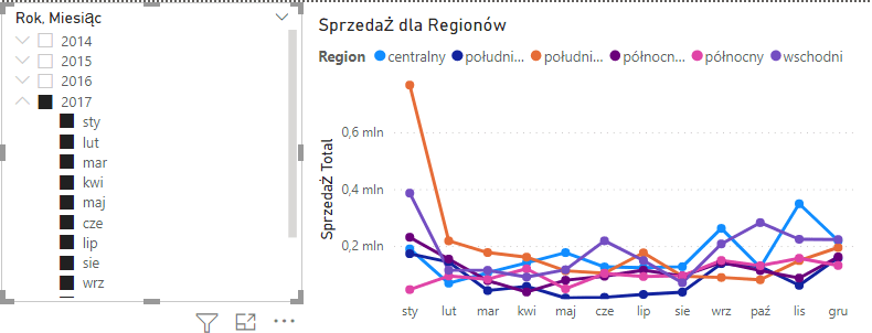 Poniższy wykres wyczerpał już półki dostępne do pokazywania danych: oś i legenda. Niestety do pokazania jest jeszcze jeden wymiar analityczny – Region. Jak sobie z tym poradzić?