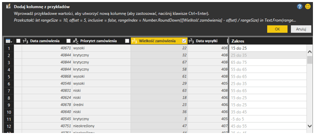 Wybieram kolumnę Wielkość zamówienia > Dodaj kolumnę > Kolumna z przykładów > Z zaznaczenia. Będę tworzyć przedziały, w pierwszej komórce tworzonej kolumny podaję przykładowy przedział „15 do 25”. Na tej podstawie zostaje uzupełniona cała kolumna, a nawet jej nazwa zmienia się na „Zakres”.