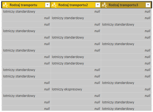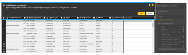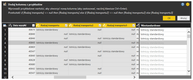 Zaznaczam kolumny Rodzaj transportu 2-3, w których posiadam nulle, ale wiem, że powinny one tworzyć jedną spójną, pełną wartości kolumnę. Wykonuję kolejne kroki > Dodaj kolumnę > Kolumna z przykładów > Z zaznaczenia. W nowej kolumnie wprowadzam prawidłowe wartości.