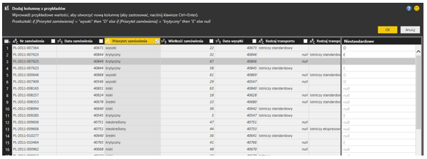 Zaznaczam kolumnę Priorytet zamówienia > Dodaj kolumnę > Kolumna z przykładów > Z zaznaczenia