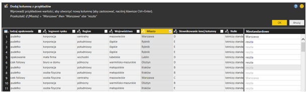 Pozwala na dodanie nowej kolumny o niejednolitych zakresach, opartej na kolumnie wejściowej. Stworzę taką kolumnę, na przykładzie Miasta, gdzie będę oddzielał Warszawę od reszty miast. Poniżej widok, jaka została generowana formuła dla nowej kolumny. Prawidłowo!
