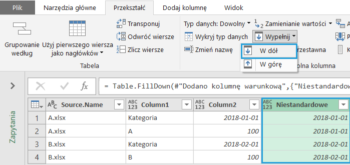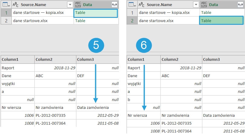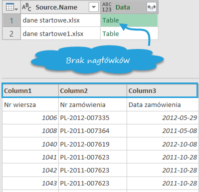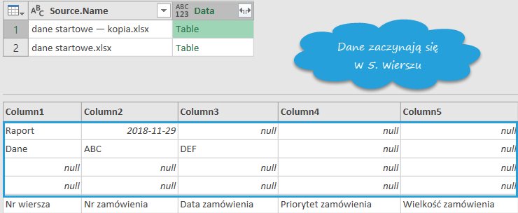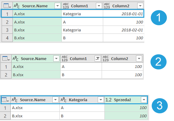 To scenariusz, który zwykle pojawia się w plikach Excel. Po wczytaniu folderu z plikami Excel nagłówki z arkuszy pojawiają się w pierwszym wierszu.