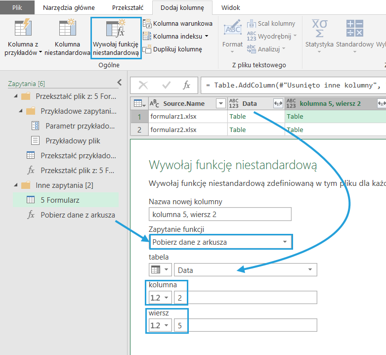 - Wywołaj funkcję niestandardową, wskazując funkcję, kolumnę z tabelami (u mnie Data), kolumnę i wiersz szukanej komórki.