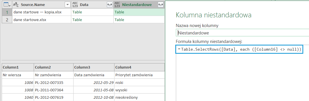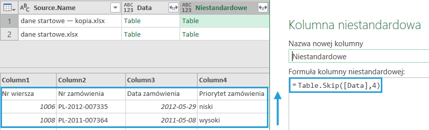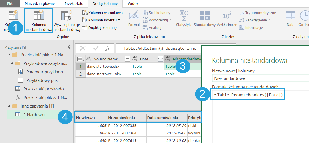 Formułę wstawiamy jako Dodaj kolumnę > Kolumna niestandardowa (1) > odwołujemy do kolumny z tabelą (2). Po kliknięciu na tabele w nowej kolumnie (3) możemy dostrzec nadane nagłówki (4). Dzięki temu mamy pewność, że operacja Dołącz, która jest integralną częścią procesu pobierania danych z folderu, wykona się na właściwych kolumnach.