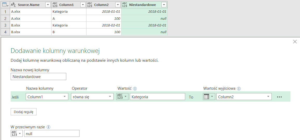 Jeśli nazwy kolumn mogą nam się przydać, możemy je przywołać do nowej kolumny poprzez Kolumnę warunkową.