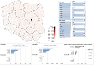 Oto przykład działania interakcji Wyróżnij i filtruj (highlighting and visual filtering) dla danych z 2010 r. dla Polski dla młodzieży w wieku 15 lat dla wymiaru „Znęcanie się”: