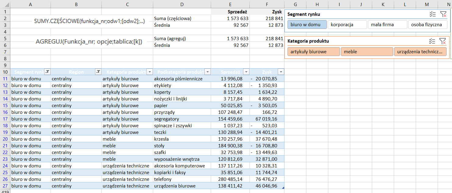 Funkcje AGREGUJ i SUMY.CZĘŚCIOWE z filtrowaniem tabeli