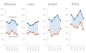 Bywają takie sytuacje, kiedy potrzebujemy porównania tak wielu danych, że stosowanie prostego wykresu kolumnowego – pomimo jego licznych zalet – byłoby trudne. Jednym z możliwych rozwiązań w tej sytuacji może być cieniowany wykres liniowy.