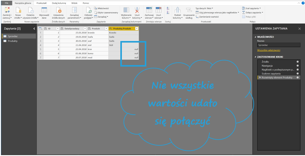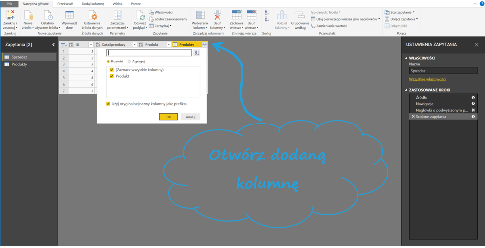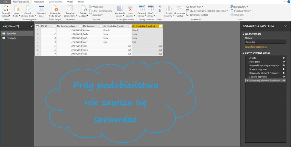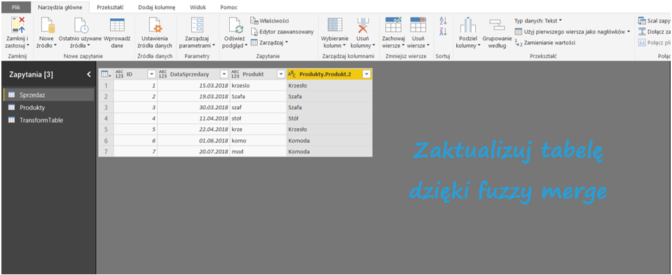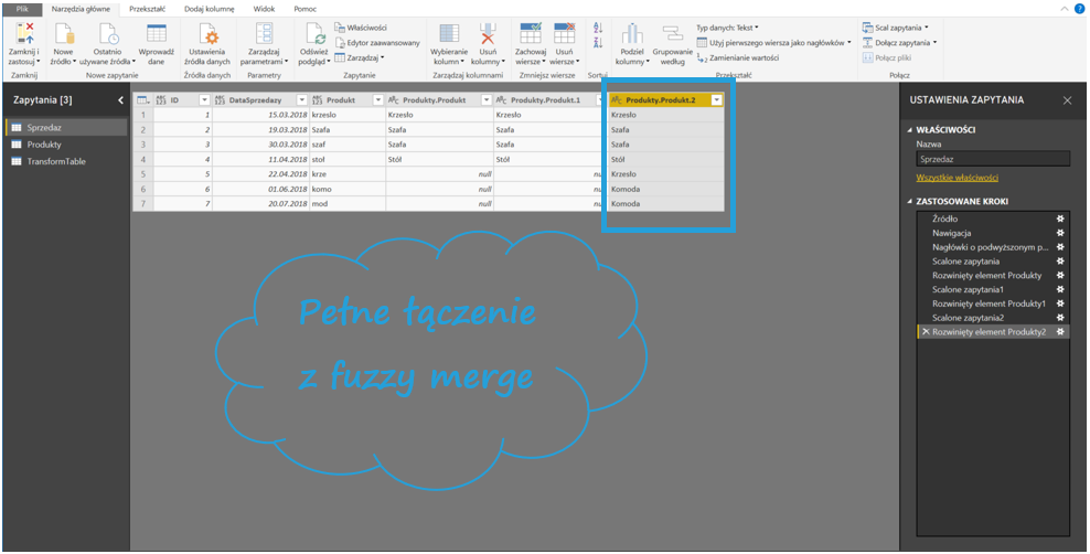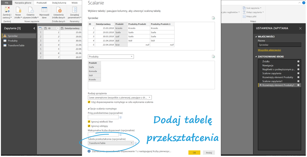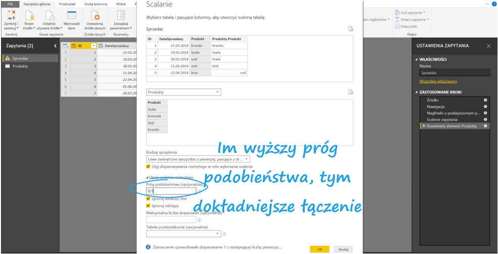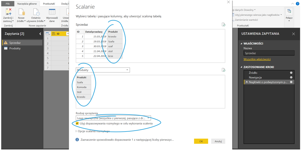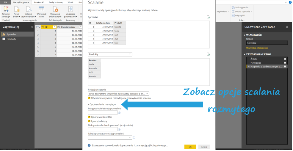 Następnie w Narzędziach głównych Power Query kliknij Połącz > Scal zapytania. Wybierz tabele, które chcesz połączyć – w moim przypadku Sprzedaż i Produkty. Zaznacz kolumny, po których tabele mają się łączyć oraz zaznacz Użyj dopasowania rozmytego w celu wykonania scalenia.