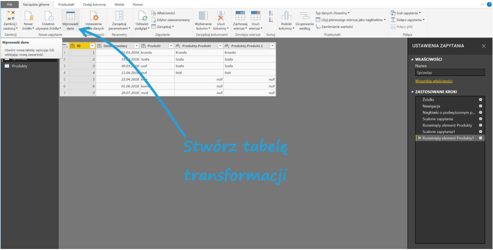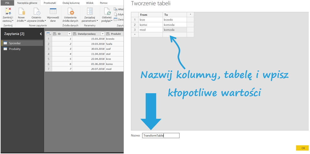 Stwórzmy zatem tabelę transformacji, która przypisze poprawne wartości. W Narzędziach głównych kliknij Wprowadź dane, a następnie stwórz tabelę z tłumaczeniem błędnych nazw na poprawne.