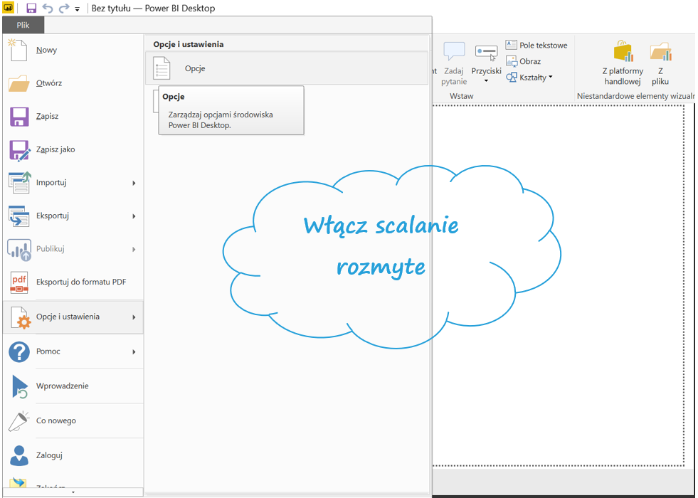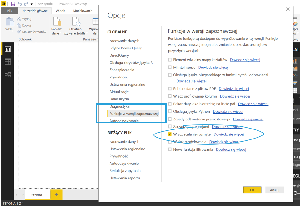Otwórz Power BI Desktop > Plik > Opcje i ustawienia > Opcje > Funkcje w wersji zapoznawczej > Włącz scalanie rozmyte.