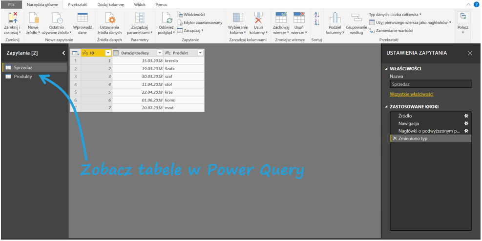 Załaduj dane i w Narzędzia główne kliknij Edytuj zapytania. Otworzysz Edytor Power Query.