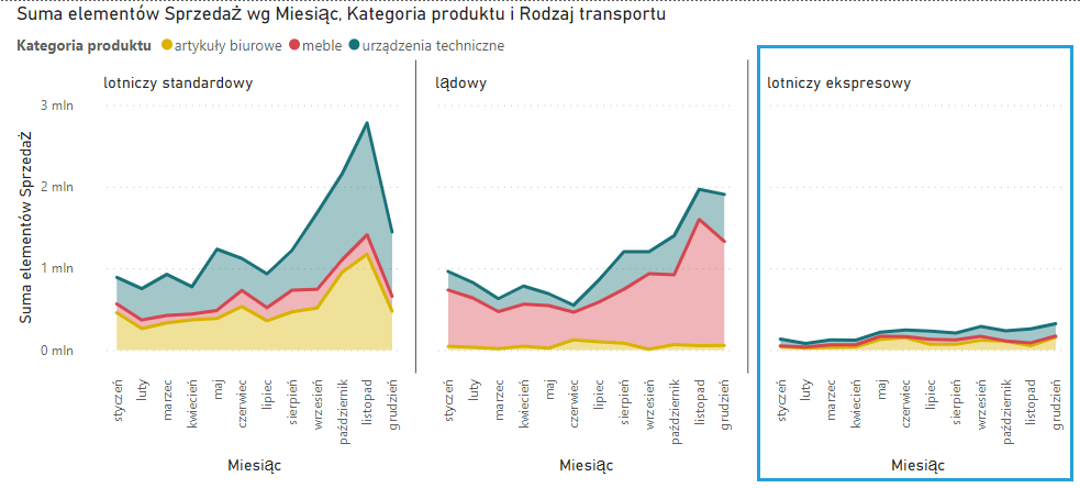 Małe wielokrotności pozwalają na stworzenie kilku stojących obok siebie i porównywalnych wykresów. Na blogu pisałem o nich artykuł, można obejrzeć też webinar nt. small multiples w Excelu i Power BI. Domyślnie osie małych wielokrotności są w Power BI zsynchronizowane. Może to być problematyczne, gdy chcemy pokazać nasze dane, ale jedna z kategorii ma znacznie większą skalę.