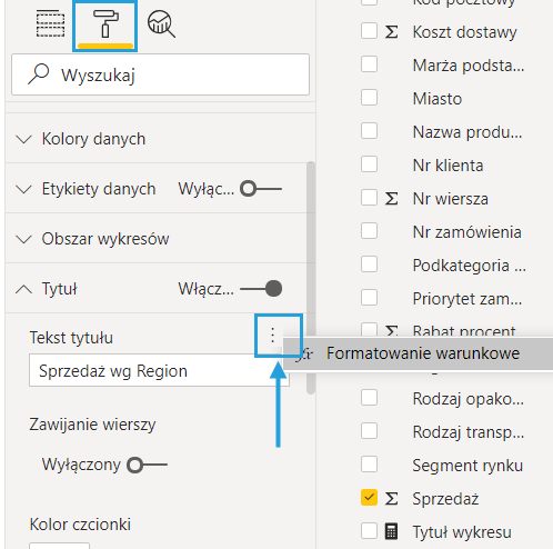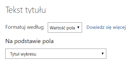 Czas teraz znaleźć 3 najbardziej schowane kropeczki świata, które odpowiadają w wielu miejscach Power BI za formatowanie warunkowe. Następnie wskazujemy źródło do działania formuły jako naszą miarę Tytuł wykresu.