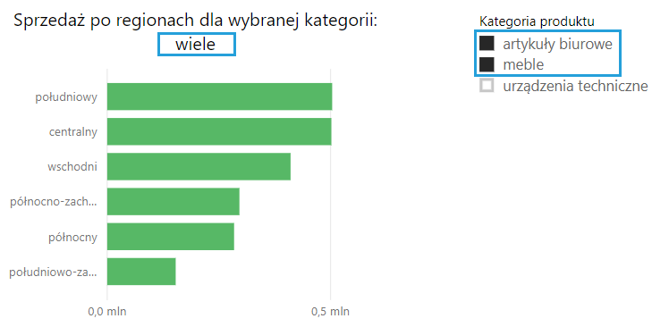 Tytuł wykresu = "Sprzedaż po regionach dla wybranej kategorii: "&SELECTEDVALUE(dane[Kategoria produktu];"wiele")