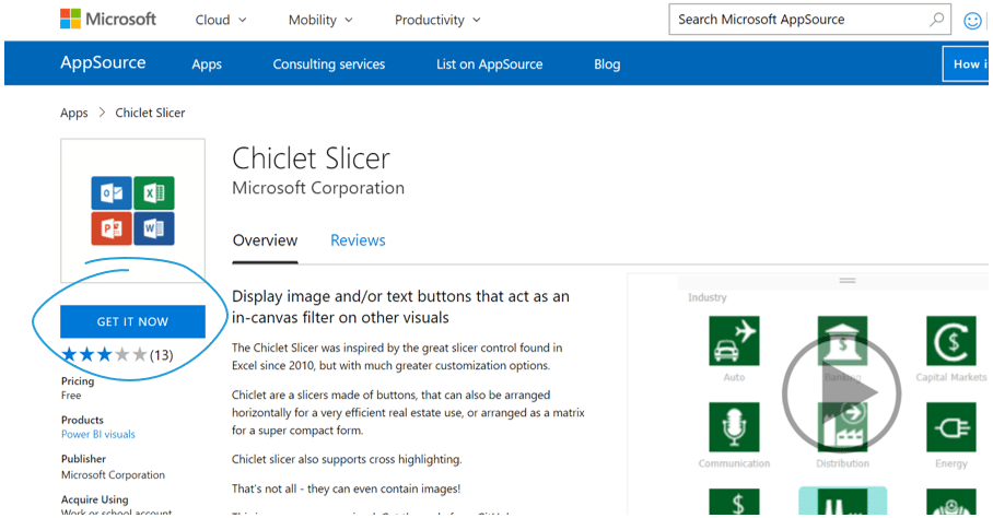 Chiclet Slicer to dodatkowa wizualizacja do Power BI, którą pobiera się (1) ze stron Microsoftu lub (2) ze sklepu wizualizacji Power BI (trzy kropki w sekcji Wizualizacja). Oto jak zrobić to pierwszym sposobem – wystarczy wpisać w wyszukiwarkę hasło Chiclet Slicer Power BI, by zostać przekierowanym na stronę internetową sklepu Microsoft. Kliknij Get it now, by za darmo pobrać dodatek.