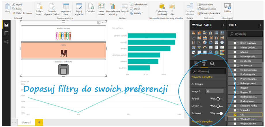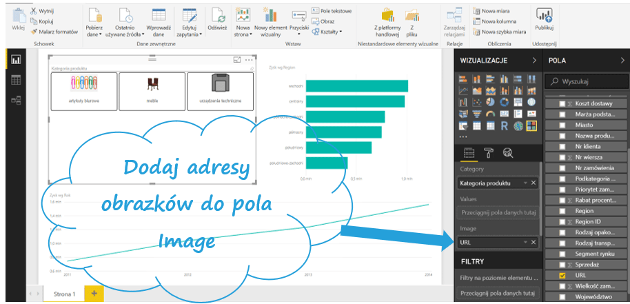 W Internecie wyszukałem obrazki, które mogłyby symbolizować kategorie produktów: artykuły biurowe, meble i urządzenia techniczne. Adresy URL grafik dodałem do bazy danych pod kolumną URL, zmieniłem kategorię danych na URL obrazu, by następnie w Chiclet Slicer wstawić je w pole Image.
