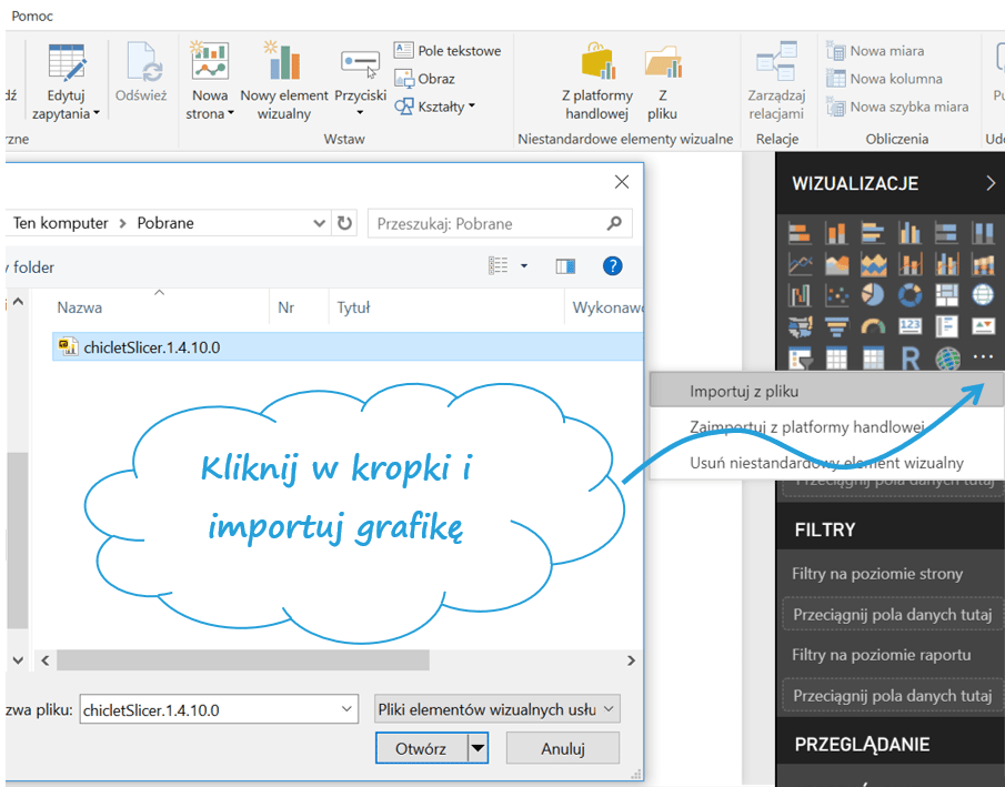 Pobierze się niestandardowy element wizualny Power BI, który należy zaimportować do programu. W panelu Wizualizacja kliknij w 3 kropki na końcu wymienionych możliwych wizualizacji, a następnie wybierz Importuj z pliku. Znajdź Chiclet Slicer i importuj go do Power BI.