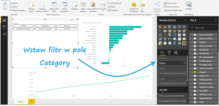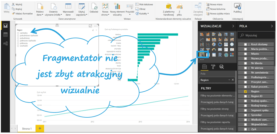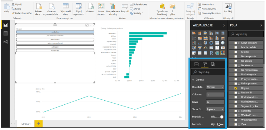Zastąpmy go Chiclet Slicerem! Jako Category wstaw Twój filtr. W moim przypadku: Region.