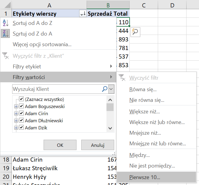Formuła tworzy wirtualną tabelę wszystkich klientów, liczy dla nich Sprzedaż Total i sprawdza, czy miejsce rankingowe jest w pierwszej dziesiątce. Jeśli tak, zwraca znacznik TOP10, a w przeciwnym razie znacznik Pozostałe.