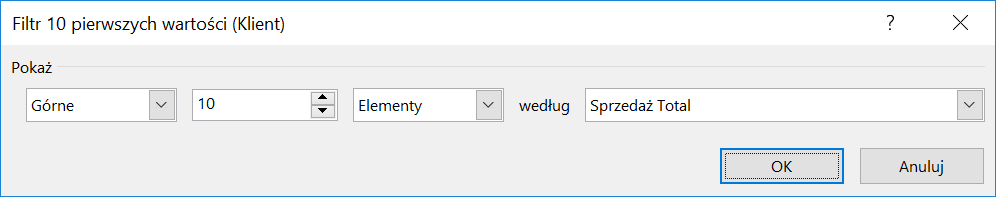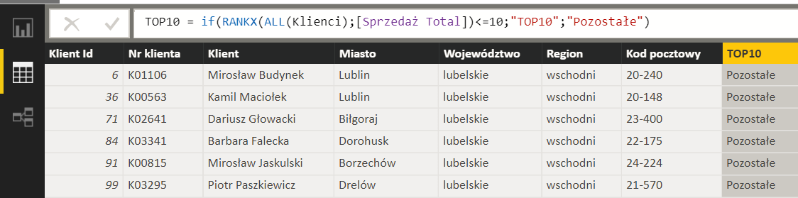 TOP10 = if(RANKX(ALL(Klienci);[Sprzedaż Total])<=10;"TOP10";"Pozostałe")