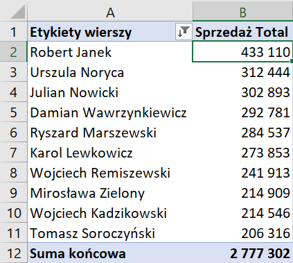 Sposób 1 – filtrowanie tabeli przestawnej Excel lub wizualizacji Power BI