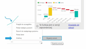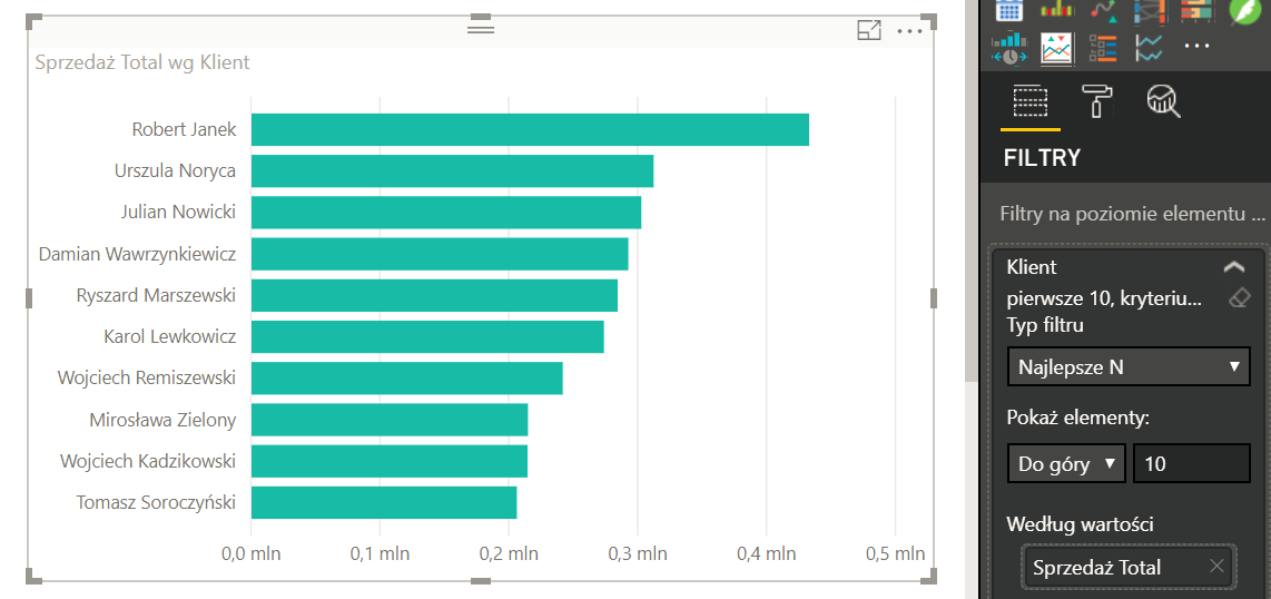 Najprostszy sposób na filtrowanie miar – wybór filtru top N z interfejsu – jest możliwy w sytuacji, gdy w wierszach tabeli przestawnej lub osi na wykresie Power BI posługujemy się polem filtrowanym. W naszym scenariuszu będzie to pole Klient.
