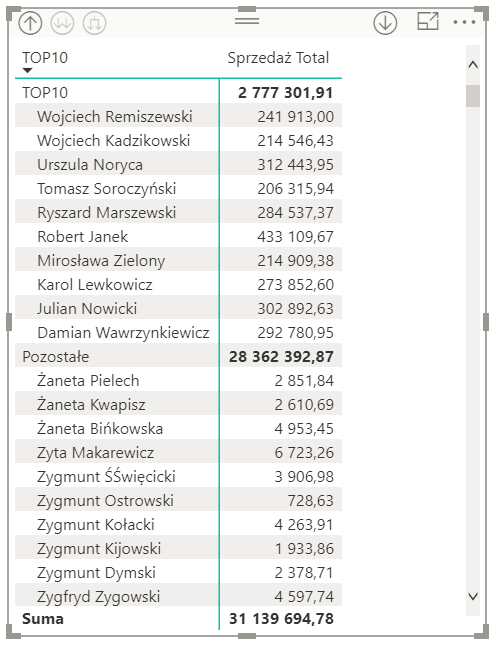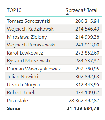 TOP10 = if(RANKX(ALL(Klienci);[Sprzedaż Total])<=10;Klienci[Klient];"Pozostałe")