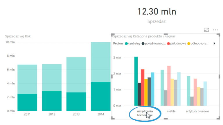 Nie możemy filtrować wykresu, jeżeli nie jest on zaznaczony – wtedy możemy używać jedynie zakładki „Widok”. Filtrowania możemy używać poprzez obiekty których używaliśmy do skonstruowania wykresów, bądź też przeciągając z listy pól obiekty które są w jakikolwiek sposób powiązane z obecnymi na powierzchni raportu wizualizacjami.