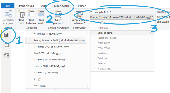 Pierwszy: w zakładce Modelowanie > Formatowanie, gdzie można wybrać typ danych i ich format, ale tylko spośród standardowych.