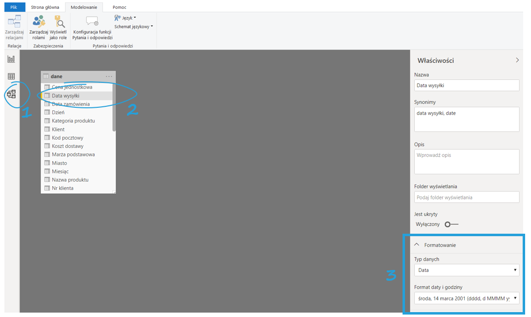 Drugi, na którym dziś się skupimy, to praca w widoku modelu. W panelu po lewej stronie kliknij ikonkę Model, a następnie wybierz kolumnę, którą chcesz edytować. W przykładzie zajmiemy się datami. Pojawi się panel właściwości i jedna z zakładek – Formatowanie.
