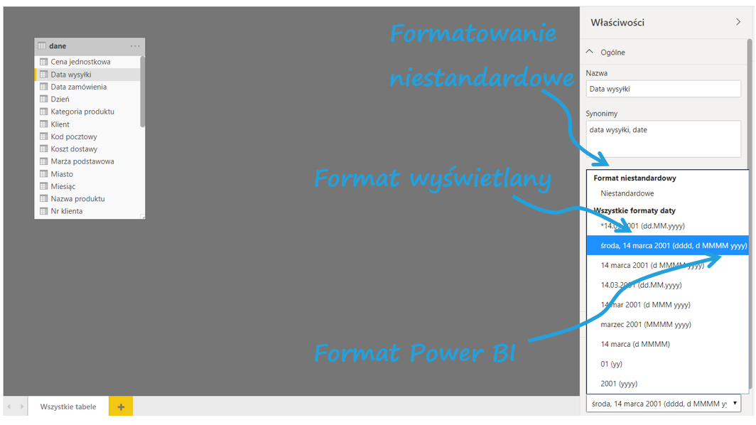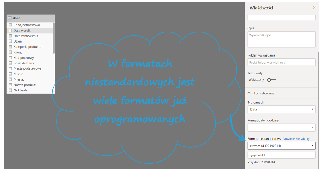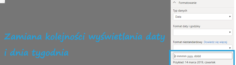 Dotychczas funkcjonowały w Power BI jedynie standardowe formaty, ale nie pozwalały na elastyczne traktowanie danych. Jeśli więc potrzebowaliśmy zapisać datę w nietypowy sposób, byliśmy ograniczeni do krótkiej listy formatów dat i nie mogliśmy formatować ich tak, jak w Excelu, np. dddd, dd mmmm yy.