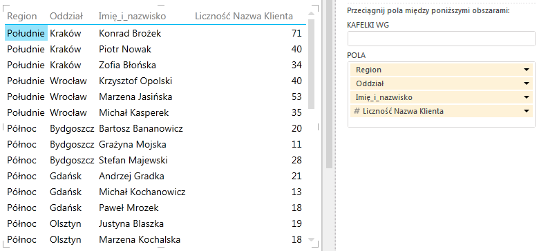 Jak widać, nasze dane są hierarchiczne: na jeden region przypada kilka oddziałów, a na jeden oddział przypada wielu sprzedawców. Tabela ukazuje ilość klientów obsługiwanych przez każdego sprzedawcę.