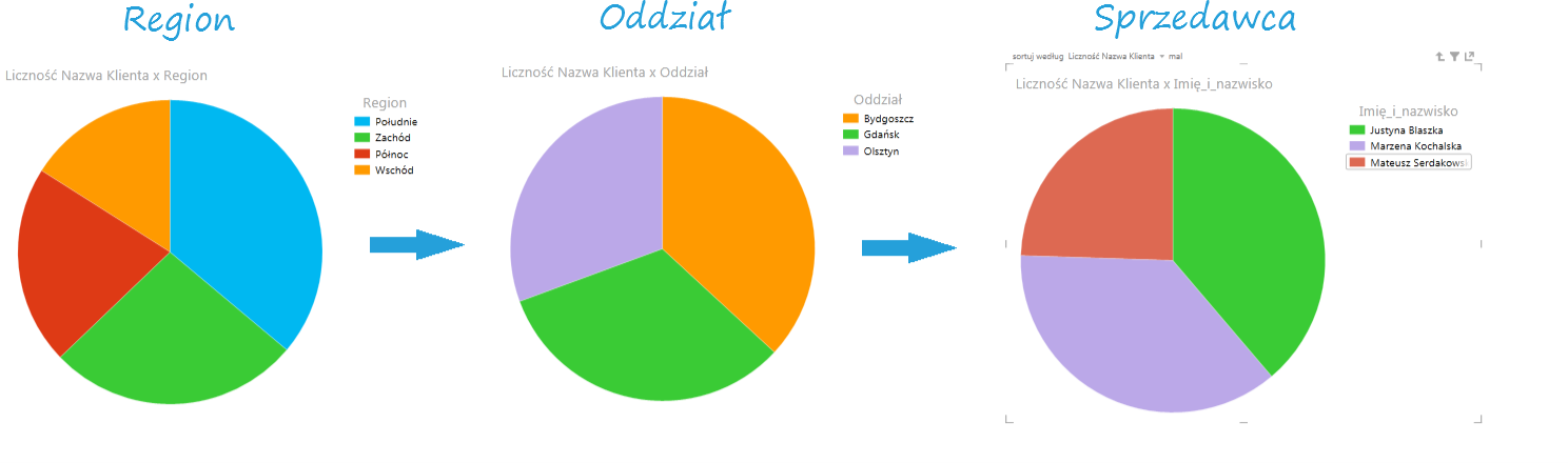 Aby przejść na wyższy poziom szczegółowości, wystarczy dwukrotnie kliknąć na wybrany przez nas region – zobaczymy wtedy wykres pokazujący udział poszczególnych oddziałów w liczbie klientów danego Regionu. Dwukrotne kliknięcie na dowolny oddział pozwoli nam zobaczyć liczbę klientów przypadających na sprzedawców pracujących w jego obrębie.