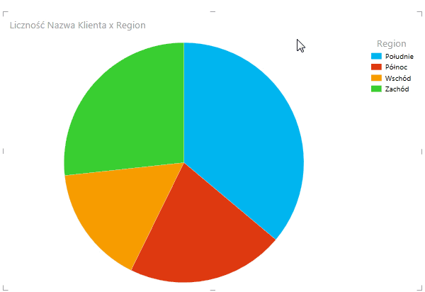Po utworzeniu wykresu kołowego na pierwszy rzut oka trudno dojrzeć znaczniejsze różnice. Tak jak poprzednio możemy sterować poziomem szczegółowości przy pomocy rozwijania i zwijania drzewa tabeli przestawnej – w tym względzie niczym się nie różni od poprzedniego wykresu. Inna natomiast jest reakcja na podwójne kliknięcie w kawałek wykresu – przechodzi on na następny poziom szczegółowości, a nie na najniższy, jak to miało miejsce w poprzednim przypadku. Ponadto po kliknięciu na element którego szczegółowość chcemy zwiększyć kawałki oznaczające inne regiony są eliminowane. Inaczej mówiąc – przechodzenie na kolejne poziomy szczegółowości zachodzi w ten sam sposób, co w raporcie PowerView.
