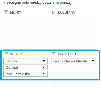 W pierwszej kolejności więc, przeciągając hierarchię lub też po prostu kolumny w odpowiedniej kolejności do obszaru POLA tworzymy tabelę zawierającą interesujące nas informacje: