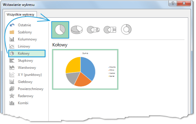 W oknie dialogowym Wstawianie wykresu wybieramy Kołowy i klikamy OK: