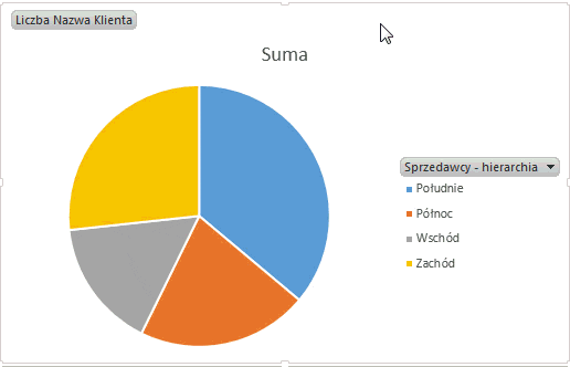 Opisywana wyżej hierarchia jest dostępna nie tylko w dodatku PowerView, ale także w zwykłym wykresie przestawnym – wykresie skonstruowanym na podstawie tabeli przestawnej. W tym przypadku jednak ma znaczenie, czy do konstrukcji tej tabeli (i przez tabelę – do konstrukcji wykresu przestawnego) użyjemy wcześniej przez nas zdefiniowanej hierarchii czy też po prostu ułożymy obiekty w odpowiednim polu we właściwej kolejności.
