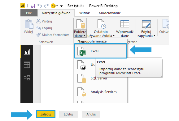 By załadować dane do modelu w Power BI należy poprzez Narzędzia główne > Dane zewnętrzne > Pobierz dane > wybrać źródło danych > W oknie Nawigatora zaznaczyć dane które mają znaleźć się w Power BI > Załaduj.