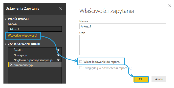 z tą różnicą, że po wyborze danych należy wybrać Edytuj (zamiast Załaduj) . Przeniosę się wtedy do okna Edytora zapytań. Po prawej stronie Edytora w Ustawieniach zapytania wybieram > Wszystkie właściwości > odznaczam opcję Włącz ładowanie do raportu > OK.